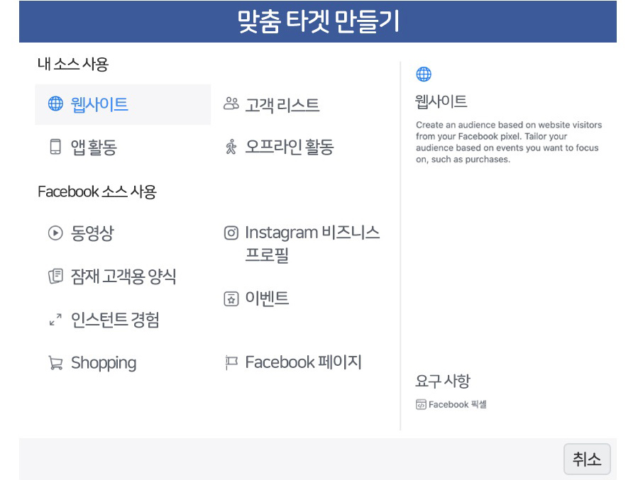 Facebook 유저 중에서 제품에 이미 관심을 보인 기존 타겟을 찾을 수 있는 기능입니다.