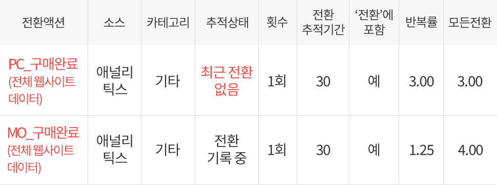구매하기 전환 이외에도 전환으로 잡고자 하는 부분의 전환도 추가로 잡아드릴 수 있습니다.